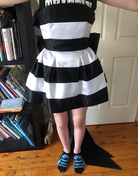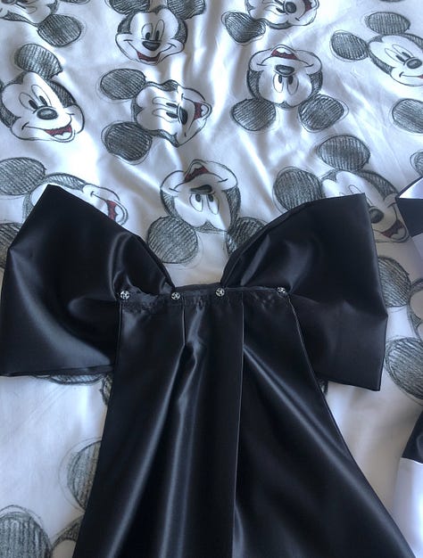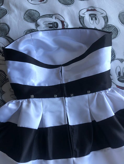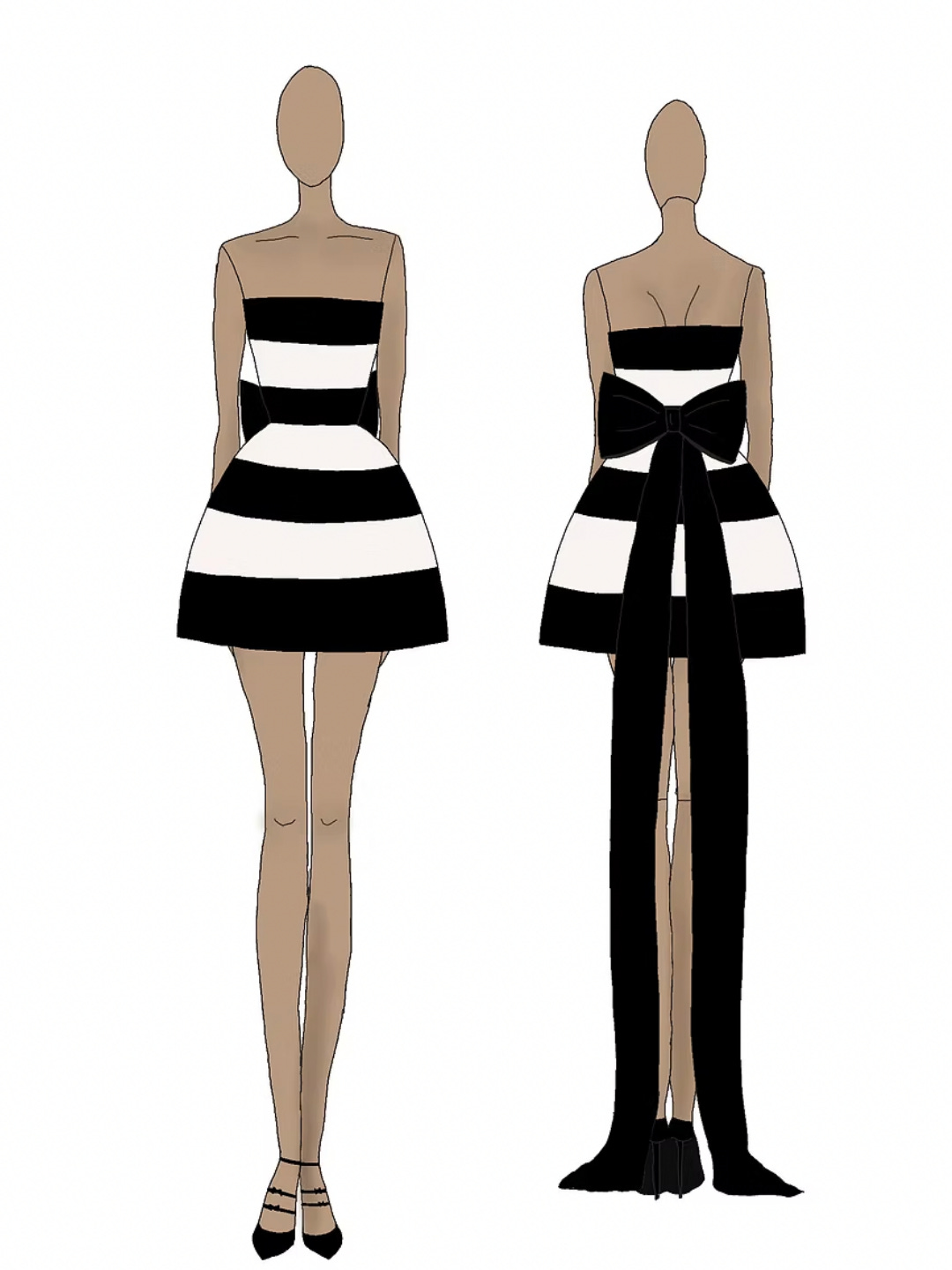 The dress I designed consisted of a strapless neckline, an hourglass mini dress, and a large detachable bow, secured with buttons on the back of the garment at the waistline.