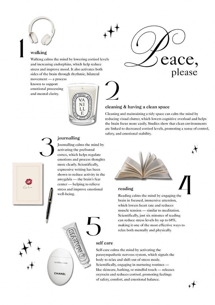 For me, a few things that help calm me down and bring me peace are:
