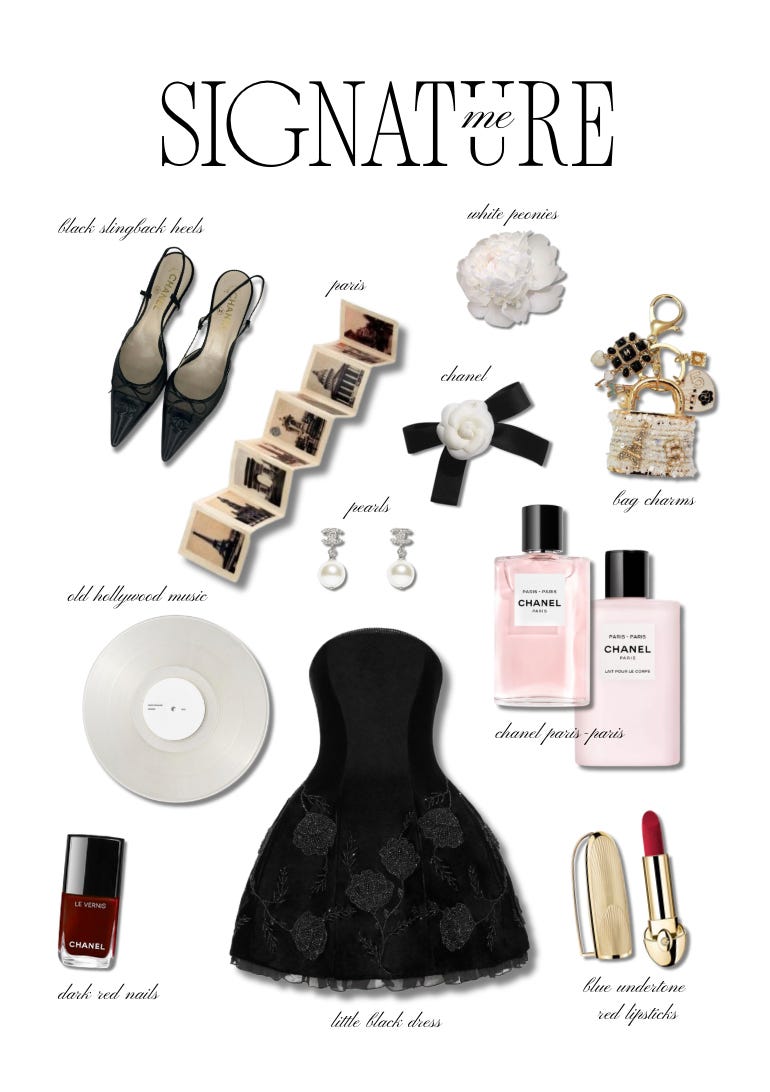 I would consider a little black dress (my going out uniform), black slingback heels, Paris, old Hollywood music and films, Chanel and Chanel beauty (fragrances in particular), dark red nails, blue undertone red lipstick, and bag charms my signature things.